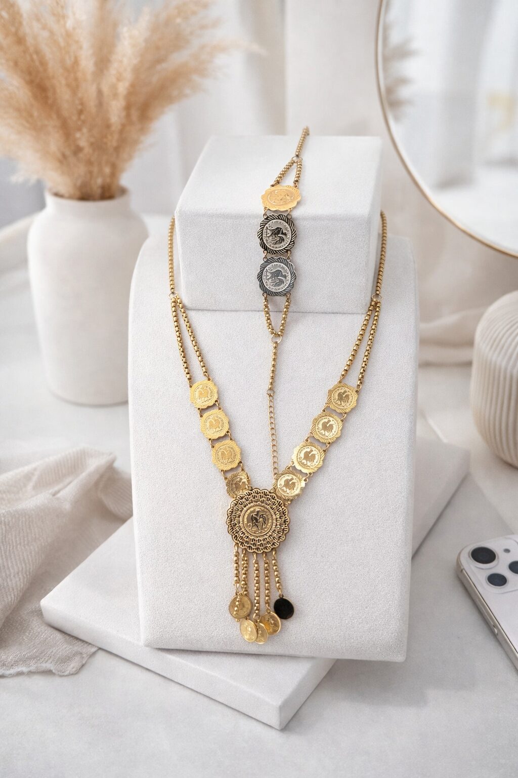 Cette parure complète se distingue par ses lignes élégantes et son motif emblématique du coq, symbole de fierté et de noblesse. Idéale pour sublimer une tenue habillée ou ajouter une touche chic à votre look quotidien.